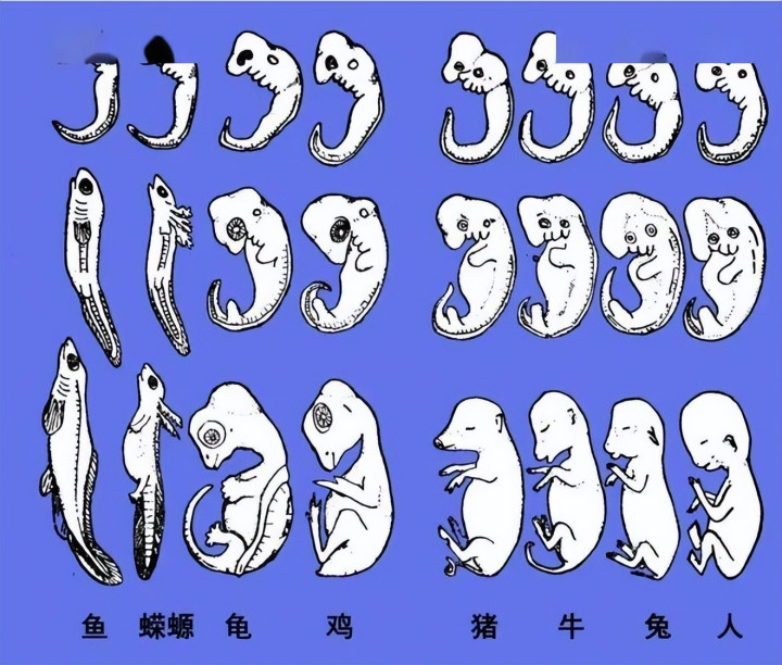 尽管陆地脊椎生物的发育时间和过程存在差异,但在胚胎发育的初期,人类与许多动物的胚胎形态却非常相似,没有专业知识的人很难分辨。在胚胎发育的早期阶段,人类胚胎和其他动物胚胎都具有一些共同的特征,如都有鳃裂和尾 。这些相似的特征,表明人类与其他动物在胚胎发育初期遵循着相似的基因调控程序,有着共同的发育基础。